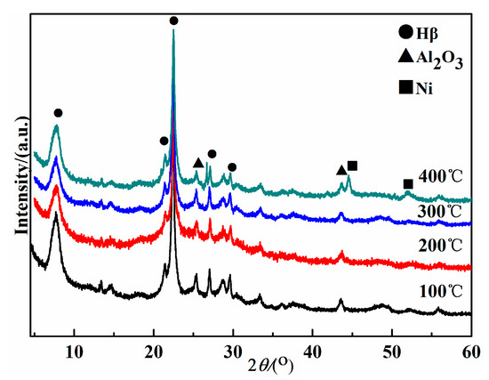 It could be clearly shown that the structural characteristics of samples remain almost the same when increasing roasting temperature. As shown by the above results (Figure 1, Figure 2 and Table 1), there is almost no change in the pore properties of catalysts when they are calcined from 100 to 400 °C, and the pore structure of catalysts exhibits good stability in this temperature range. The reason for this lies in the fact that both Hβ and Al2O3 of the carrier have good thermal stability, and the pore structures of the samples remained intact below 400 °C.