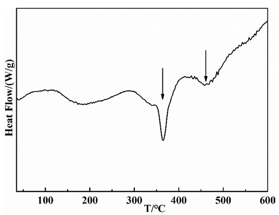 Figure 4 shows the DSC results of the NiP nanoparticles when determining the crystalline temperature. There is an obvious endothermic peak below 200 °C, which is mainly caused by the release of adsorbed water. As the heating temperature increases, two exothermic peaks located at about 360 and 460 °C can be observed, which are related to the crystallization of amorphous NiP nanoparticles. The exothermic peak at 360 °C can probably be ascribed to the structural transformation of NiP active components from amorphous phase into crystalline Ni3P [31]. The exothermic peak at about 460 °C is probably related to the transformation of metastable phase to stable Ni phase, a process that begins at about 440 °C.