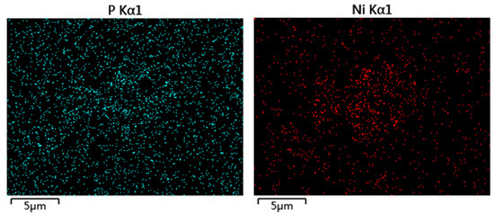 Figure 6 shows the SEM-mappings of the catalyst, containing the dispersion of P and Ni, respectively. For the catalyst calcined at 200 °C, the amorphous NiP nanoparticles are dispersed well, and the results are coincident with the XRD (Figure 3) and TEM results (Figure 5).