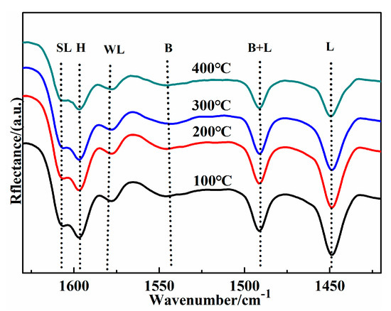 The Py-IR spectra of catalysts roasted at different temperatures are shown in Figure 7. The bands generated by pyridine adsorbed on Bronsted (B) and Lewis (L) acid sites are located at approximately 1540 and 1450 cm−1, respectively. On the whole, there is almost no difference in the number of Brønsted and Lewis acid sites for samples roasted at different temperatures [32,33]. The bands appearing at around 1610 and 1575 cm−1 suggest the existence of strong and weak Lewis acid sites, respectively [34]. The numbers of strong Lewis (SL) acid sites in samples calcined at 100 °C, 200 °C and 300 °C are almost the same [35]; however, the number of SL acid sites in the sample roasted at 400 °C is slightly decreased in comparison with the other samples. The reason for this can be attributed to the fact that the existence of SL acid sites is closely associated with the unsaturated nickel atoms of amorphous NiP nanoparticles. When the calcination temperature is increased to 400 °C, NiP nanoparticles gradually transform from their amorphous state into a crystalline Ni phase (Figure 3), decreasing the amount of unsaturated Ni atoms and ultimately leading to a decrease in the number of SL acid sites.