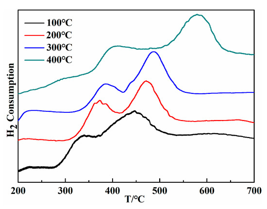 The reduction profiles of different samples are presented in Figure 9. Two distinct reduction peaks can be observed in the TPR curves of all of the samples, implying that there are two reducible species appearing in the reduction process under the H2 atmosphere. The low-temperature peak is probably generated by the reduction of the amorphous NiP nanoparticles into Ni3P; meanwhile, the high-temperature peak can be attributed to the reduction of Ni3P into Ni on the catalyst [31,39]. With the increase in calcination temperature for samples from 100 °C to 400 °C, the low-temperature reduction peak gradually increases from 330 °C to 400 °C, and the high-temperature peak gradually increases from 450 °C to 600 °C. It can be observed that catalysts are more difficult to reduce with the increase in calcination temperature, and the increased difficulty in reduction could be related to the stronger interaction of NiP nanoparticles and Ni3P reducible species with the carrier.