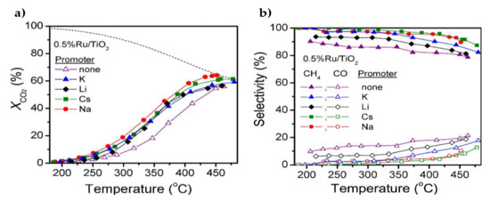 One of the few works reporting a promoting effect of various alkalimetals during the CO2 methanation reaction was conducted by Petala et al. [33]. The authors employed quite a small loading of alkalimetal promoters (0.06–0.4 wt.% of Li, Na, K and Cs) by impregnating the corresponding alkali precursor salts on the TiO2 support. A low (0.5 wt.%) and a high (5 wt.%) Ru loading was achieved via a subsequent impregnation step of Ru(NO)(NO3)3. The lower active metal loading resulted in a smaller Ru crystallite size. Interestingly, it was found that alkali addition had a greater impact on the catalyst with the low Ru loading (0.5 wt.%), in comparizon to that with the high Ru loading (5 wt.%), and an optimal Na loading of 0.2 wt.% was obtained for the former (i.e., 0.5 wt.% Ru/0.2 wt.% Na-TiO2). These results agree with the general features of alkali promotion on several catalytic systems, which typically obey a volcano-type behavior with respect to the promoter/metal ratio; low promoter/metal ratios are inefficient to induce succesful promotion, high promoter/metal ratios lead to over-promotion (poisoning) [32]. The catalytic activity and CH4 selectivity were promoted according to the following order with respect to the alkali identity: TiO2 (unpromoted) < Li ≈ K < Cs < Na, as shown in Figure 1 [33]. In a continuation of this work, Panagiotopoulou [34] employed in-situ DRIFTS and transient-mass spectrometry in order to shed light on the reaction mechanism. Alkalimetal addition on the low Ru loading catalyst appeared to favour the formation of Ru-bonded carbonyl species (Rux-CO), which are key intermediates towards the production of CH4.