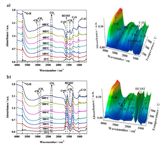 Modification of the Al2O3 support with a KOH strong base was performed by Zhang et al. [45] and the reaction intermediates were followed via in-situ DRIFTS. KOH was first dissolved in d-H2O and then introduced into the Al2O3 support, while Ni was impregnated during a second step. KOH addition led to a dramatic decrease of the Al2O3 surface area and after calcination, K2CO3 and K2O phases were also detected. The introduction of the strong KOH base led to the increased presence of adsorbed formate intermediates during CO2 hydrogenation, which was validated via in-situ DRIFTS (Figure 2) [45]. This strong interaction with the formate intermediate species apparently did not allow for their further hydrogenation to CH4 and instead led to a high CO selectivity. The Ni-KOH/Al2O3 catalysts, on the other hand, could be considered as more suitable candidates for the RWGS reaction and the steam reforming of acetic acid, in an antithesis to other works: