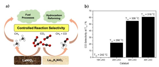 (a) CO2 hydrogenation product selectivity for the catalysts derived from LaNiO3 and K-substituted (La1-xKxNiO3) perovskites; (b) rising CO selectivity towards the RWGS at T50% for the catalysts containing increased amounts of K. Reproduced with permission from ref. [51]. Copyright 2020 MDPI.