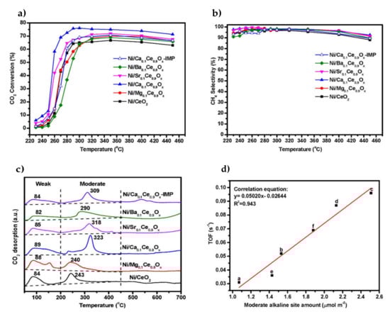 Ni/CeO2 catalysts are among the most active for CO2 methanation and are a main research focus. CeO2 has a high oxygen storage capacity (OSC) that, together with its redox properties due to the Ce4+/Ce3+ redox couple, promotes the stability of the active metal particles and suppresses the formation of coke. Furthermore, CeO2 facilitates a strong interaction with the supported metal phase [54,55]. Liu et al. [30] conducted a comprehensive study, where they doped the CeO2 support of Ni/CeO2 catalysts with various alkaline earth metals, with the aim to further enhance their low-temperature catalytic activity. Alkaline earth metal nitrates were introduced during the citrate sol-gel synthesis of the CeO2 support with a molar ratio of 1/9, compared with Ce(NO3)3·6H2O. Mg2+ and Ca2+ appeared to fully dissolve into the CeO2 lattice, while SrCO3 and BaCO3 secondary phases were detected in the other two samples. The Ca-doped catalyst induced the highest promotion effect, measured via the CO2 conversion and turnover frequency (TOF) increase at low temperatures, with the Sr-doped one being second-to-best. The higher turnover frequency could be linearly correlated with two related factors, namely the increase in the population of oxygen vacancies (Ce3+/(Ce3+ + Ce4+) molar ratio) and moderate alkaline sites (200–450 °C peaks in the CO2-TPD profiles), as shown in Figure 4.