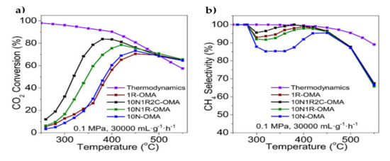 Catalytic properties of the prepared catalysts: (a) CO2 conversion and (b) CH4 selectivity; (c) lifetime test of the 10N1R2C-OMA catalyst. Reproduced with permission from ref. [75]. Copyright 2018 Elsevier.