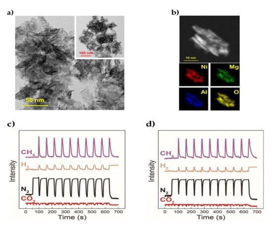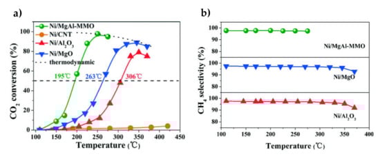 The cooperation between the Ni catalytically active phase and the MgO alkaline phase in hydrotalcite-derived catalysts has been studied by Liu et al. [90]. The authors varied the Ni2+/Mg2+ molar ratio during the coprecipitation synthesis, while the ratio between trivalent (Al3+) and divalent (Mg2+ and Ni2+) cations remained constant. After calcination and reduction, the formed Ni nanoparticles were well-dispersed over the MgO-Al2O3 support with an average crystallite size of about 2.5 nm. Two types of basic sites were observed upon CO2-TPD, namely weak basic sites for CO2 adsorbed on Al2O3 phase and moderately strong basic sites for CO2 adsorbed on MgO phase. Regarding the catalytic performance for CO2 methanation, the hydrotalcite-derived catalysts presented far superior low-temperature CO2 conversion compared with other Ni-based catalysts supported on Al2O3, MgO and carbon nanotubes (CNTs) (Figure 7a). Moreover, a linear correlation could be derived between TOFNi values and the amount of moderately strong basic sites on the support (Figure 7c). The reaction mechanism proposed involved a CO2 activation step by the support basic sites to carbonate/hydrocarbonate species and an H2 dissociation step on the Ni metallic sites. The interplay between these two phases facilitated the excellent low-temperature activity towards CO2 methanation.
