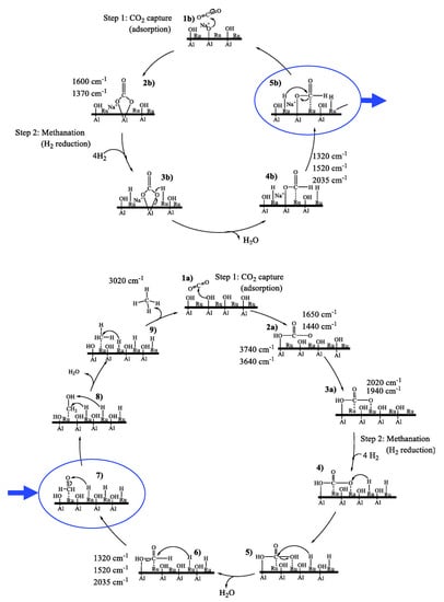Proposed CO2 methanation mechanism over 5%Ru/Al2O3 (down) and extended (up and down) for over 5%Ru, 6.1%“Na2O”/Al2O3 DFM. Reproduced with permission from ref. [116]. Copyright 2019 Elsevier.