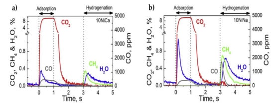 Besides the Farrauto group, Bermejo-Lόpez et al. [24] performed a thorough work to describe the mechanism of CO2 capture and methanation, as well as to correlate the type and loading of the adsorbent phase with the material’s performance (Figure 10). Ru metal dispersion was one parameter dependant on the adsorbent type, with CaO seeming to hinder it, while Na2CO3 promoting it. The basicity of the materials increased with higher adsorbent loading and this promoted the CH4 yield. CaO provided strong basic sites, where CO2 was chemisorbed forming stable carbonates (CaCO3) that required higher temperatures to be desorbed. On the other hand, medium-strength basic sites over Na2CO3 led to the formation of less stable carbonates, enabling operation at lower temperatures. The proposed reaction mechanism involved an initial adsorption of CO2 with simultaneous release of H2O from the sorption active phases. During the following methanation step, adsorbed CO2 spilled over to Ru sites and was hydrogenated to methane, while a delay in the H2O signal could be attributed to some H2O-product being adsorbed by the basic sorbent sites and forming Ca(OH)2 and NaOH.