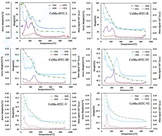 Thermogravimetric analysis and mass spectrometry detector (TGA-MS) analysis of the CoMn-HTC catalysts.