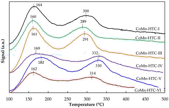 Ammonia temperature-programmed desorption (NH3-TPD) profiles of the CoMn-HTC catalysts.