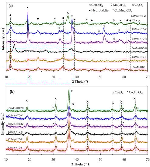 The X-ray diffraction (XRD) patterns of the prepared catalysts are shown in Figure 5. The XRD patterns of dried catalysts (Figure 5a) showed that the CoMn-HTC catalysts had crystallized hydrotalcite structure forms, with characteristic peaks at 11.9°, 23.5°, 34.3°, 39°, 47.5°, 60.8°, and 62.9°, which correspond to the (0 0 3), (0 0 6), (0 0 9), (0 1 5), (0 1 8), (1 1 0), and (1 1 3) planes (JCPDS #70−2151) [,,].