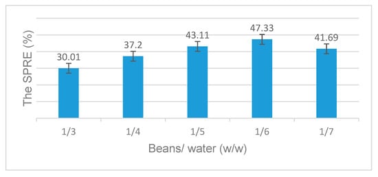 Several studies have demonstrated that the substrate/water ratio affects the efficiency of hydrolysis. According to Figure 2, in turn, changing the soybean/water ratio to 1/3, 1/4, 1/5, 1/6, and 1/7, the highest ratio of soybean/water to the ratio of SPRE reached 47.33%.