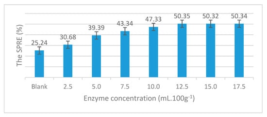 Next, we investigated the effect of enzyme content on the hydrolysis process by Flavourzyme to determine the suitable enzyme for hydrolysis to achieve the best SPRE. Figure 3 shows that increasing the enzyme content from 2.5 to 5, 7.5, 10, and 12.5 mL·100 g−1 (corresponding to the activity of 5.55 U·g−1, 11.1 U·g−1, 16.65 U·g−1, 22.20 U·g−1, and 27.75 U·g−1), the SPRE gradually increased from 30.68% to 50.35%. Continuing to increase the enzyme content to 15–17.5 mL·100 g−1 (corresponding to activity 33.30 ug−1, 38.85 U·g−1), the SPRE reached equilibrium. Therefore, the enzyme content of 12.5 mL·100 g−1 was selected for the next experiments.