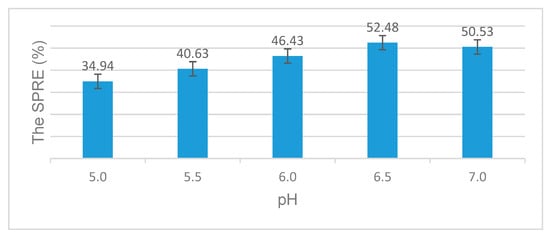 pH plays an important role in moderating enzyme activity due to its strong influence on the ionization of protein and enzyme stability. The soluble protein recovery efficiency depends on the optimal pH, so pH is the top-priority factor to be identified. In addition, the optimal pH for hydrolysis varies depending on the substrate. To be specific, when using Alcalase, upon the substrate of salmon skin, optimal enzymatic hydrolysis was found to correspond with the pH of 8.39 [21]. The hydrolysis values of the blood of basa fish and fish waste of iridescent shark were 7.05 and 9.45, respectively [22,23]. According to the survey results, when the pH increased from 5 to 5.5, 6, and 6.5, then the SPRE increased. Continuing to increase from 6.5 to 7, the SPRE tended to decrease. From Figure 4, it is found that at pH 6.5, the SPRE was the highest (52.48%). Therefore, pH 6.5 is chosen as the appropriate pH for the enzymatically hydrolyzed soy protein using Flavourzyme.