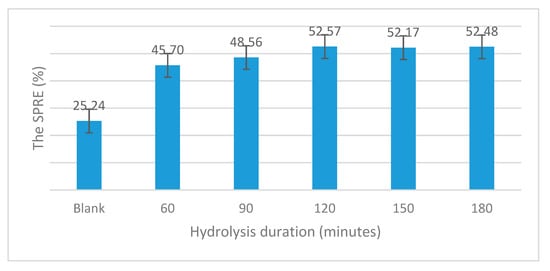 The hydrolysis time is positively correlated with hydrolysis efficiency. In this experiment, the time varied from 60 to 180 min to investigate its effect on the recovered protein. Figure 6 shows that generally, the substrate hydrolysis reaction occurs quickly in the first 2 h; the SPRE increased from 25.24% to 52.57%. After that, even if it increased to 150 or 180 min, the SPRE reached equilibrium. Therefore, 120 min was chosen as a suitable duration to conduct enzymatic hydrolysis using Flavourzyme without thermal treatment.