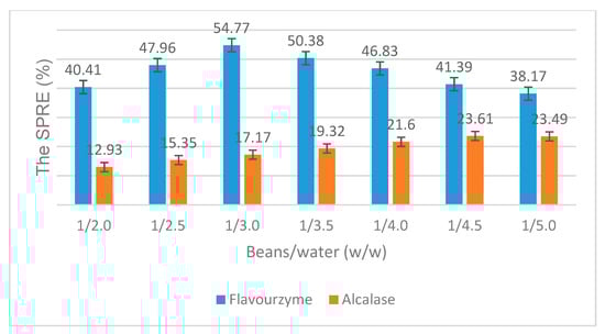 Figure 8 shows that when using Flavourzyme, changing the ratio of beans/water respectively from 1:5 to 1:3, the concentration of the substrate increased gradually, while the SPRE increased from 38.17% and reached the highest value of 54.77%. However, if the substrate concentration continued to increase (corresponding to the ratio of beans/water increasing from 1:3 to 1:2.5 and 1:2), the achieved SPRE decreased from 54.77% to 40.41%. Therefore, we chose the ratio of 1:3 for the production process to reach the highest SPRE.