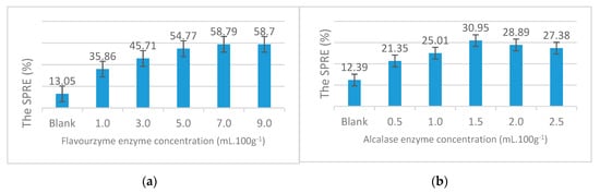 From Figure 9, when using Flavourzyme, changing the enzyme content to 1, 3, 5, 7, and 9 mL·100 g−1, respectively (corresponding to the activities of 2.22 U·g−1, 6.66 U·g−1, 11.10 U·g−1, 15.54 U·g−1, and 19.98 U·g−1), the results showed that when the enzyme content increased, the SPRE also increased. Specifically, when the enzyme content increased from 1% to 7%, the SPRE increased from 35.86% to 58.79%. However, when the enzyme content increased from 7% to 9%, the SPRE reached unchanged. According to ANOVA and LSD (Least Significant Difference) analysis, the SPRE achieved at 7% and 9% was not significantly different. The highest enzyme content of 7% (corresponding to activity 15.54 U·g−1) was selected for the next experiments. Compared with the control sample (without enzymatic hydrolysis), which only reached about 13.05%, the hydrolytic enzyme samples achieved higher figures. Similarly, when using Alcalase, the enzyme content of 1.5% (corresponding to the activity of 26.74 U·g−1) gave the highest SPRE and was selected for the next experiments.