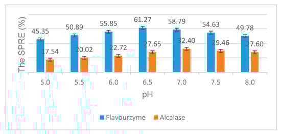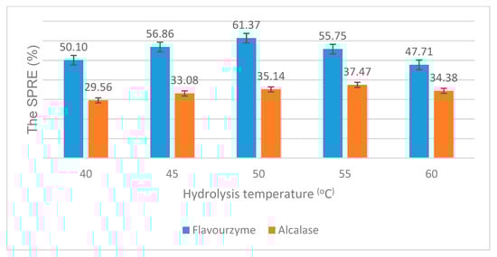 Figure 11 shows that for Flavourzyme, when the hydrolysis temperature increased from 40 to 45 and 50 °C, the SPRE respectively increased from 50.10% to 61.27%. Moreover, continuing to increase the temperature up to 55 and 60 °C, the SPRE achieved was reduced. To sum up, at 50 °C, the SPRE was the highest (61.27%) when using Flavourzyme for soybean enzymatic hydrolysis (p < 0.05). For Alcalase, the SPRE increased while increasing the hydrolysis temperature from 40 to 55 °C and tended to decrease slightly when increasing the temperature to 60 °C. When the hydrolysis temperature reached 55 °C, the SPRE was the highest at 37.47%. Nevertheless, when heating to 60 °C, the figure decreased to 34.38%. According to ANOVA and LSD analysis, the SPRE figure of Alcalase at 55 °C was the highest (p < 0.05). The results showed that using Flavourzyme achieved a SPRE 1.63 times higher than that of Alcalase.