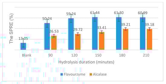 Figure 12 shows that for Flavourzyme, when the hydrolysis time increased, the SPRE also increased. The enzymatic hydrolysis reaction occurred strongly in the first stage when using Flavourzyme; the SPRE increased from 13.05% to 50.24% (at 90 min). Over time, the enzymatic hydrolysis still occurred, and the bonds decreased, while the protein content still increased but not as much as the first time. When the hydrolysis duration reached 150 min, the SPRE reached the highest level (61.44%). After that, when prolonging to 180 and 210 min, the SPRE increased insignificantly.
