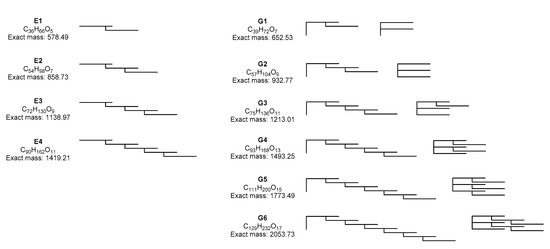 Structures of estolides (E) and glycerides (G). Within each glyceride group (G1–G6) the different isomers have identical chemical formulas and masses (not all isomers are shown).