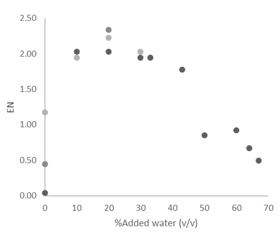 EN measured by NMR as a function of added water to the reaction (% of total reaction volume). Some reactions were performed in duplicates or triplicates.