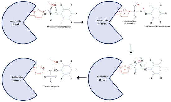 Phytic acid is the principal storage and indigestible organic form of phosphorous, accounting for up to 85% of the total phosphorous in plant seeds []. Phytase (myo-inositol hexakisphosphate phosphohydrolase) is an enzyme that catalyzes the hydrolysis of phytic acid (myo-inositol hexakisphosphate) through the stepwise approach to produce inorganic phosphate. Phytase is usually used in monogastric animal diets as a feed additive to boost phosphorus nutrition from their feed that is supplied from seeds, legumes, nuts, and grains. Besides, phytate can also form complexes with carbohydrates and proteins, thereby decreasing their hydrolysis. Phytate has detrimental effects on the environment through eutrophication []. Phytate with a negative charge acts as an antinutritional factor through chelating minerals with positive charges, such as iron, calcium and zinc. This results in the bioavailabilities of these minerals being decreased in the bodies of monogastric animals and poultry [,]. The fact that the principal source of food of monogastric animals is phytate-rich plants, the degrading of phytate by an appropriate phytase enzyme should be taken into consideration to liberate phosphorous and to avoid the antinutritional effects of phytate [,]. Sources of phytases are animals, plants and microorganisms, including yeasts, other fungi and bacteria. Phytases have different structures and catalytic mechanisms according to their sources and can be grouped as β-propeller phytases, purple acid phytases, cysteine phytases and histidine acid phosphatases (HAPs). The most envisaged groups of phytases are histidine acid phosphatases (HAPs), as shown in Figure 1, and β-propeller phytases, as shown in Figure 2. They have different catalytic mechanisms and similar products [,]. Furthermore, phytases are classified based on the first phosphate that is liberated from the inositol ring of phytic acid, including 3-phytases (EC: 3.1.3.8), 6-phytases (EC: 3.1.3.26) and 5-phytases (EC: 3.1.3.72), as shown in Figure 3. Microbial phytases from Aspergillus, Escherichia and Bacillus species are widely studied for industrial applications [,]. There are some challenges to the use of the phytase enzyme in monogastric animals, including high temperature during the pelleting process from 65 to 95 °C and acidic pH range (2.5–5.5). Despite the resistance of the desired phytase enzyme to high temperature, its optimum activity should be in accordance with the body temperature of poultry (41 °C to 42 °C) [], as shown in Figure 4. Resistance to proteolytic degradation in the digestive tract and the high activity of phytase are additional advantages []. Therefore, the desired phytase should have stability against high temperature, acidic pH and proteases (pepsin and trypsin) [,]. So, to use phytase as an industrial enzyme, stability should be increased. Detecting and rigidifying flexible regions through the use of computational analysis is a powerful approach in the stabilization of enzymes. Two prevalent approaches, including root mean square deviation (RMSD) and root mean square fluctuation (RMSF) are usually used to detect overall flexibility and flexible sites in the phytase structure. B-factor is used as an indicator to find thermolabile residues []. In this review, all four required properties (thermostability, acid stability, protelolysis stability and improved activity) for the industrial application of phytase are considered, based on the results of several studies done in recent years.