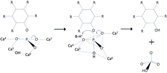 Catalytic mechanism of BPP. The Ca2+ ions decrease pKa of water forming hydroxide ion (deprotonated form of water). OH- donates an electron pair to the positive phosphorus in phosphate to form intermediate state. Then, the general acid donates a proton, thus cleaving the phosphoester bond to release phosphate group.