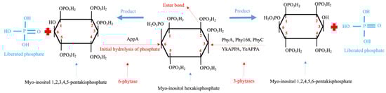Catalytic reactions of 3 and 6-phytases3-phytases start the hydrolysis of ester bond between phosphate group and inositol ring at position C3, while 6-phytases start to attack at position C6 of inositol ring and liberate phosphate.