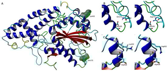 Tang and his team employed directed evolution and site-directed mutagenesis approaches on the Aspergillus niger N25 phytase gene and, among all of the mutants obtained, the double mutant Q172R/K432R showed 40% improvement in thermostability over that of the PP-NPep-6A (the mutant that had been obtained through error-prone PCR in their previous study) at 80 °C for 10 min []. The half-life of Q172R/K432R showed a 6.8 min enhancement over that of PP-NPep-6A. Mutation Q172R was situated on the surface loop, due to the introduction of a salt bridge with D165, which connected a β-sheet and an α-helix, as shown in Figure 5A,B. The loop area was stabilized as a result of introducing this salt bridge. K432R was situated on the surface area at the C-terminus of an α-helix, which introduced a strong H-bond and a salt bridge with D428, as shown in Figure 5A,C. Substituting K432 with R brought about the interaction between the more positively charged R with the negatively charged C-terminus of the α-helix, resulting in the improved thermostability of the phytase. Although Q172R/K432R showed the highest thermostability, its catalytic efficiency was lower over those of the other mutants. This decrement in catalytic efficiency was a trade-off of elevated rigidity [].