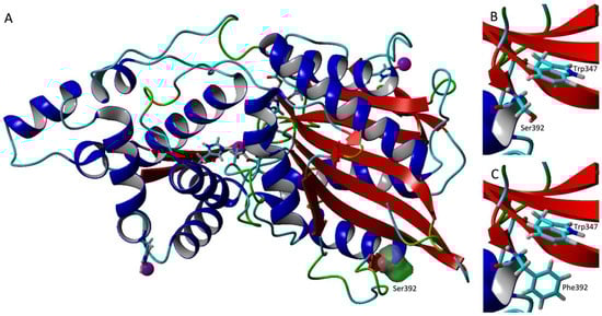 (A): Mutation site of S392. (B): Location of residues S392 and W347. (C): Substitution of S392F, which introduced two hydrophobic interactions with W347.