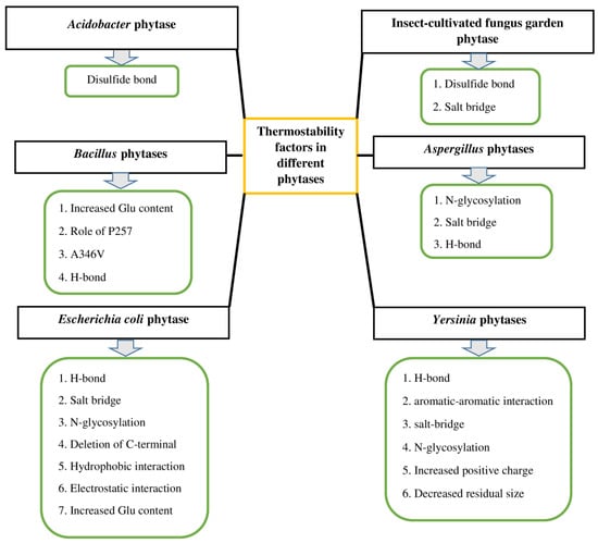 During the pelleting process to prepare food for monogastric animals, phytase should tolerate high temperatures from 65 °C to 95 °C []. Phytase enzymes from Aspergillus niger, Escherichia coli, Yersinia species and Bacillus species had been mainly studied to enhance their thermostabilities for industrial applications, as shown in Table 1. Several improved thermostable phytases are discussed, based on the decisive modifications in their structures.