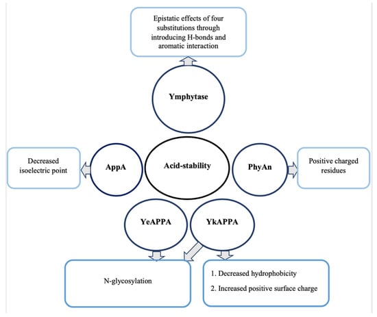 The pH range in the digestive tract of chicken is between 2.5–5.5. The pH in the crop is 5.5, and in the proventriculus and gizzard they are 2.5 to 3.5. Exogenous phytase activity mainly occurred in the abovementioned three upper parts of the digestive tract. Hence, phytase should be stable at these pH ranges []. Here, details in the latest studies were examined to find contributing factors, as shown in Figure 8, for the acid stability of phytases, as shown in Table 2.
