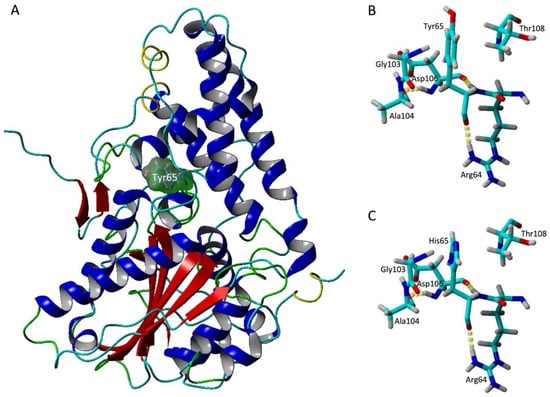 Mutation on Aspergillus phytase. (A): Mutation site of residue Y65 at conserved active motif, RHGARYP. (B): Interactions between Y65 and its surrounding residues. (C): Interactions between H65 and its surrounding residues.