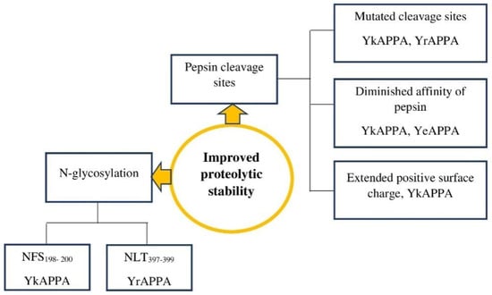 Two enzymes—pepsin and trypsin—with proteolytic activities in the digestive tract of poultry are considered as barriers to proteins and enzymes that are added to industrial chicken diet. Pepsin cleavage sites are at the N-terminals of the aromatic amino acids tryptophan, tyrosine and phenylalanine, while the trypsin cleavage sites are at the C-terminals of arginy1 and Lysy1 peptide bonds []. In this section, the contributing factors, as shown in Figure 10, in proteolytic stability are described, as shown in Table 3.