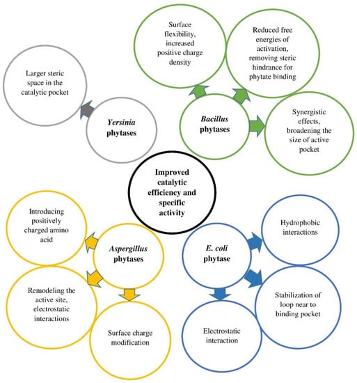 Exogenous phytase activity widely happened in the upper part of the digestive tract of poultry, including the crop, proventriculus and gizzard. Optimum activity depended on optimum pH and proteolytic stability in the digestive tract. Other factors, such as feed ingredient composition and age, gender and species of poultry, could also influence phytase activity for breaking down phytate in the digestive tract []. Recently, some teams had carried out different studies on phytases, taking into account several factors, as shown in Figure 11, from microbial sources, including Aspergillus, Escherichia coli, Bacillus and Yersinia, to improve phytase activity for improving catalytic efficiency and specific activity, as shown in Table 4.