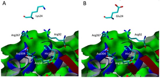 Mutation on phytase from Escherichia coli. (A): Location of residue K24 at surface of the pocket edge. (B): Substitution K24E. Part of the secondary structures was cut to reveal location of residues near the binding pocket using YASARA Structure software.
