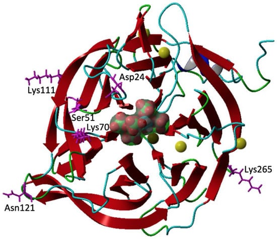 The mutation sites D24, S51, K70, K111, N121 and K265 of Bacillus subtilis phytase surrounding the bound phytate.