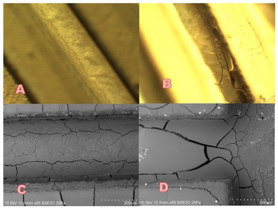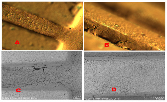 GXCAM-5 microscope images (A,B) and SEM images (C,D) of Au/SBA-15 catalyst coating in the channels of the microreactor before (A,B) and after (C,D) heat treatment; Technique 3.