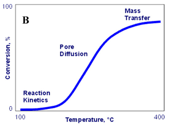 As expected, the mass transfer limitations at high temperatures are not as severe as those observed in the conventional reactor; in fact, for the flow rates of 33.2 mL/min and 37.9 mL/min, respectively, no mass transfer limitations were observed in the microreactor. At low temperatures, the rate determining step was the reaction kinetics while at intermediate temperatures, the pore diffusion was the main factor affecting the progress of the reaction, for both, microreactor and conventional flow reactor.