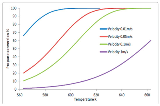 Propane exit conversion against temperature at inlet velocity of 0.01, 0.05, 0.1, and 1 m/s, respectively over Au/Cr/γ-Al2O3 catalyst. Reprinted with permission from [62], 2016, Longdom Publishing SL.