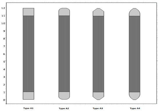 In addition to the effect of the number of branched microchannels and the microchannel’s shape and size, the flow distribution is strongly affected by the shape and volume of the inlet and outlet manifolds. The main design challenge was to establish the manifold geometry which allows a uniform flow-distribution into the microchannels. For this reasons, four different geometries namely type A1, A2, A3, and A4 (named according to the shape of the manifold) were proposed as shown Figure 8.