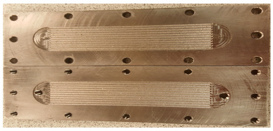 Photos of two fabricated microreactor plates having 11 rectangular parallel microchannels/slots and inlet and outlet manifolds on stainless steel 315 L.