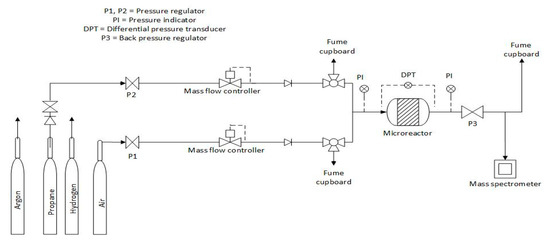 The catalyst coated microreactor was initially treated with 5% H2 in argon stream 30 mL/min at 300 °C for 2 h and then flushed with a pure argon flow for 30 min. In order to avoid any re-oxidation of the catalyst prior to the reaction, C3H8 flow was fed immediately after and allowed to stabilize before adding the air flow to the feed. Prior to the catalytic study, thermal oxidation experiments were performed using the non-coated reactor. This allowed measurements to be made that distinguished between catalytic oxidation effects and thermal conversion effects. There was no measurable thermal oxidation reaction at the temperatures observed. Propane conversion was calculated using Equation (4).