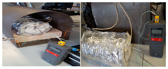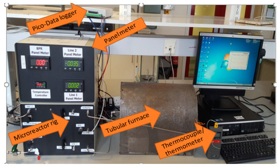 A tubular furnace has been designed and built consisting of a tubular stainless steel pipe (35 cm length and 10 cm diameter) coiled with a fiber glass heating tape (Omega Engineering Inc. Manchester, UK, FGH102-100, 1040 W, 240 V) and a ceramic jacket (VITCAS ceramic fiber blanket 25 mm thick) (which was used to prevent the heat loss). The ceramic fiber blanket is wrapped with a heat resistant aluminum foil tape, 25 mm × 45 m for excellent insulation. The microreactor is introduced at the center of the tubular furnace. Its temperature is monitored by a K-type thermocouple with 1 ms time response (according to the manufacturer), inserted at the wall (see Figure 16). The high temperature heating tape is controlled using an auto tuning PID temperature controller (Omega Engineering, Inc., Manchester, UK, CN7500 series). The temperature controller is mounted on the front of the instrument cabinet/panel meter for the purpose of regulating the energy that is used to heat the furnace.