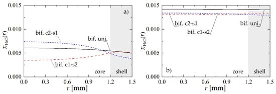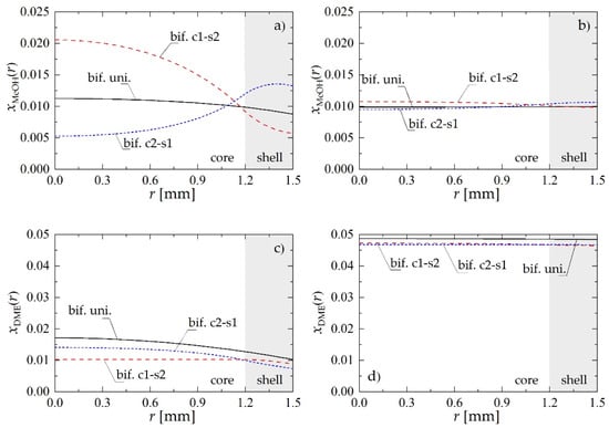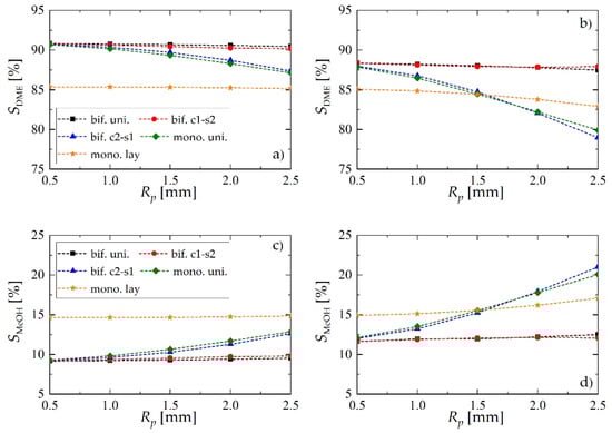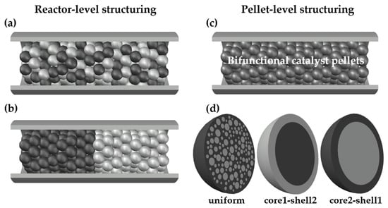 - A bed made of bifunctional pellets characterized by core-shell distribution (Figure 1c,d), where core1-shell2 arrangement concerns the pellet with MeOH and DME active centers distributed, respectively, in the pellet core and shell, while core2-shell1 denotes reverse arrangement of two type of active centers within the pellet.