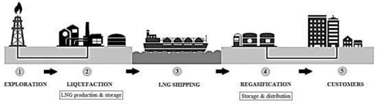 Liquefied natural gas (LNG) is a colourless, non-toxic, non-corrosive and clear liquid mixture, containing mainly methane (88.4 to 99.7%) and other light hydrocarbons such as: ethane, propane, butane and nitrogen. LNG is natural gas cooled to the temperature of –162 °C. Its low temperature results in shrinks of the gas volume about 600 times, making its more economical to transport and storage. Overseas and long-distance transport of natural gas via pipeline is not economically feasible. Besides, natural gas has a very low density and is highly explosive; this causes it to be very costly to transport and storage. Therefore, liquefied natural gas is now a cost-competitive and clean fuel, especially for shipping and road transport. LNG can also be turned back into a gas during regasification process. Figure 1 present the global LNG business, which is described as a “value chain” containing elements such as: exploration, liquefaction, shipping and storage/regasification. Nowadays, steam reforming (SR) of natural gas and other hydrocarbons is the main commercial process used to syngas production []. This reaction is characterized by the high H2/CO molar ratio and low selectivity and yield to CO production. However, the SR process is a highly endothermic reaction that makes it energetically expensive [,]. The exothermic partial oxidation of methane (POM) reaction is more promising from the application point of view. The advantages of POM process are the high conversion of raw material and selectivity and short residence time assigned to a H2 to CO molar ratio ≈2 [,]. However, POM reaction present also several disadvantages, such as: risk of explosion and catalyst deactivation caused by overheating [,].