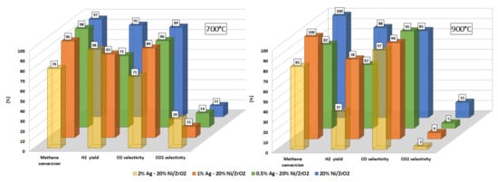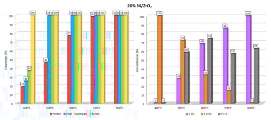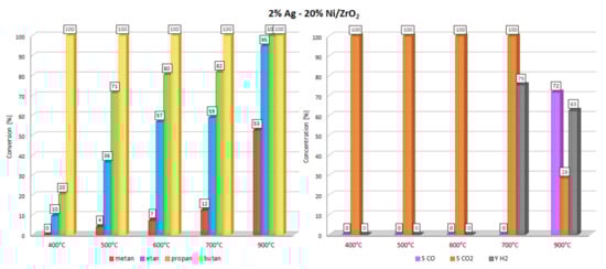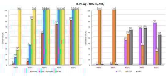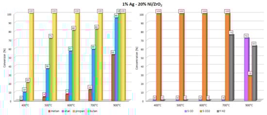 In the next stage of the catalytic activity measurements, the oxy-steam reforming of LNG reaction was studied, and the results are given in Table 2 and Table 3 and in Figure 3, Figure 4, Figure 5 and Figure 6, respectively. The OSR of LNG process was performed in the temperature range 400–900 °C. The LNG conversion results are presented as conversion of LNG components, such as: methane, ethane, propane and butane. The results of the activity tests showed that the increase of the reaction temperature result in increase of the LNG components conversion values for all the studied catalytic systems. At 500 °C, only monometallic catalysts exhibited total conversion of ethane, propane and butane. Meanwhile, all bimetallic catalysts exhibited only complete conversion of butane. The catalytic results obtained for all catalytic materials for the reactions carried out at 600 °C indicate that only in the case of monometallic Ni and bimetallic 0.5%-20% Ni and 1%-20% Ni catalysts total conversion of ethane propane and butane has been confirmed. In the case of 2% Ag-20% Ni catalyst, the activity results obtained at 600°C confirmed incomplete conversion of methane (7%) ethane (57%) and propane (80%). Starting from a reaction temperature of 600 °C, total conversions of ethane, propane and butane were confirmed for monometallic and bimetallic catalysts, with 0.5 and 1% of silver. Only in the case of the bimetallic catalyst containing 2wt.% of Ag, was incomplete conversion of methane, ethane and propane observed at 700 °C. Moreover, at 900 °C, during the investigated process, incomplete values of methane and ethane conversion were also detected. The activity results indicate that hydrogen yield was the highest for this bimetallic catalysts at 700 and 900 °C. Meanwhile, at low temperature (500 and 600 °C) range, the highest hydrogen yield exhibited 20% Ni/ZrO2 catalyst. All investigated catalyst systems exhibited an increase of the CO selectivity values with increasing of the reaction temperature. It is also worth emphasizing that for bimetallic catalysts containing 2 wt.% of Ag, the CO was formed only at 900 °C. The opposite trend was observed towards CO2 formation. The selectivity toward CO2 formation decreases for monometallic catalyst system above 400 °C and for bimetallic 0.5% Ag-20% Ni/ZrO2 and 1% Ag-20% Ni/ZrO2 catalysts above 500 °C. Monometallic 20% Ni/ZrO2 catalyst system showed the hydrogen formation already at 500 °C in contrast to bimetallic catalysts, for which the hydrogen formation was observed starts from 600 °C for 0.5%-20% Ni and 1% Ag-20% Ni catalysts. Whereas, for 2% Ag-20% Ni/ZrO2 catalyst, only CO2 and H2 products formation up to 700 °C were observed. The highest hydrogen yield value exhibited bimetallic 2% Ag-20% Ni/ZrO2 catalyst at 700 °C, however, at a low conversion values of LNG components. The comparison of the oxy–steam reforming of methane (OSR of methane) and liquefied natural gas (OSR-LNG) processes showed that in the case of OSR-LNG reaction we observed for all investigated catalysts lower hydrogen production yield, compared to the OSR of methane process.