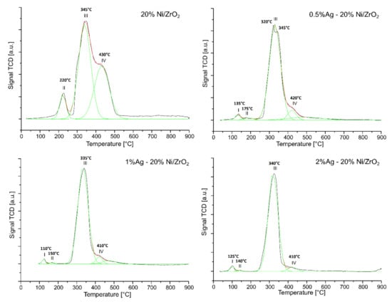 The temperature programmed reduction profile of ZrO2 (result not shown in this paper) support showed two reduction peaks located in the temperature range 250–350 °C and 470–520 °C, respectively []. According to the literature data [,], the first and the second reduction effects are associated with the reversible hydrogen uptake of the ZrO2 surface. Meanwhile, the authors of the work [] reported that they did not observe any reduction peaks on the TPR profile recorded for ZrO2 material. They claimed also that only the ZrO2 surface near the metal particle is slightly reduced at high temperature. The TPR profile of monometallic 20% Ni/ZrO2 catalyst shows three reduction peaks located at about 220, 345 and 430 °C, respectively. The first reduction stage marked in the Figure 7 as peak II is assigned to the reduction of free NiO species (Tmax 220 °C). The next two unresolved reduction effects located in the temperature range 280–500 °C, with a maximum of the hydrogen consumption positioned at about 345 and 430 °C are associated with the reduction of NiO species differently interacted with the carrier. The second reduction peak is attributed to the reduction of NiO weakly interacting with the carrier. The third reduction peak (marked as peak IV in Figure 7) visible on TPR profile is connected with the reduction of NiO strongly interacted with the support. Ren et al. [] also studied the reduction behaviour of Ni/ZrO2 catalyst and they also observed three reduction peaks at 324, 344 and 385 °C on the TPR profile. They assigned the low and high reduction temperatures peaks to NiO species, weakly and strongly interacting with the support. The reduction peaks positioned at 324 and 344 °C were associated with NiO species that are of similar nature to pure bulk NiO. Meanwhile, the reduction peak located at 385 °C was attributed to NiO species interacting with the support, whereas, the TPR profiles recorded for bimetallic Ag-Ni catalysts show four reduction stages connected with the reduction of silver oxide and NiO species. The first low temperature reduction effects visible for all bimetallic catalysts in the temperature range 100–190 °C are assigned to the reduction of silver oxide (see Figure 7). The first reduction peak for the 0.5% Ag-20% Ni bimetallic catalyst associated with the reduction of silver oxide is observed for a maximum of hydrogen consumption located at 135 °C. Increasing the silver content to 1 wt.% shifts the observed reduction peak to a temperature of 110 °C. However, the maximum of the same reduction effect in the case of the catalyst with the highest silver content is visible at a temperature of 125 °C (see Figure 7). The second reduction stages visible on the TPR profiles of bimetallic catalysts are associated with the reduction of unbounded NiO. Their low intensity decreases with the increasing of the Ag content in the catalytic material. This reduction stage is visible for monometallic catalyst at 220 °C. On the other hand, for bimetallic catalysts containing 0.5, 1 and 2 wt.% of silver, the same effects are visible at 175, 140 and 130, respectively (see Figure 7). The third reduction peak visible on the TPR profile of 0.5% Ag-20% Ni catalyst, with the maximum at 320 °C attributed to the reduction of NiO weakly interacted with the support. The same reduction steps for the rest of the bimetallic catalysts were visible at 335 and 330 °C, for 1% Ag-20% and 2% Ag 20% Ni catalysts, respectively. The last reduction peaks of the bimetallic catalysts assigned to the reduction of NiO strongly interacted with the support are located at 420, 410 and 410 °C for 0.5% Ag-20% Ni, 1% Ag-20% Ni and 2% Ag-20% Ni catalysts, respectively. In the case of these high-temperature peaks, a shift of their maxima towards a lower reduction temperature compared to the monometallic catalyst was confirmed. The reduction studies clearly show that the increase in silver content in the case of bimetallic catalysts shifts the reduction peaks towards the lower temperature range. In addition, in the case of bimetallic catalysts, the intensity of the observed reduction effects related to the reduction of NiO strongly interacting with the support decreases compared to the same effect observed for the nickel catalyst. These results indicate that silver addition facilitates the reduction of NiO species. Hengne et al. [] studied the reducibility of the monometallic and bimetallic Ag-Ni/ZrO2 catalysts and they detected two H2 consumption peaks in the temperature range 270-520 °C, connected with the sequential reduction of Ni2+ to Ni0. Furthermore, for the bimetallic Ag-Ni catalyst also two H2-TPR peaks located at low temperature with two maxima at 265 and 485 °C were detected. These effects were ascribed to the reduction of silver oxide and NiO species. Kaori Yoshida et al. [] reported that the addition of noble metal on the surface of the Ni based catalyst facilitates its reduction behaviour. This effect is explained by the flows of hydrogen from the silver to NiO surface which improves its reduction explained by the spillover effect. However, in the oxy-steam reforming of methane reaction, the reducibility of partially oxidized species derived from the metal particles is very important. The amount of the reduced species in the OSRM process dependent on the reduction rate of the partially oxidized species and the oxidation rate of the metal species. In addition, in order to evaluate the influence of the silver on the reducibility of the Ni catalysts the reduction degree of the monometallic and bimetallic catalysts were determined, based on the hydrogen consumption peaks and the calculated results are presented in Table 6. Total H2 consumption calculated for monometallic Ni catalysts was 2.7 mmol/gcat. Meanwhile, the addition of 0.5 wt.% of Ag into monometallic systems practically did not lead to any change in the value of hydrogen consumption. The calculated hydrogen consumption for this bi