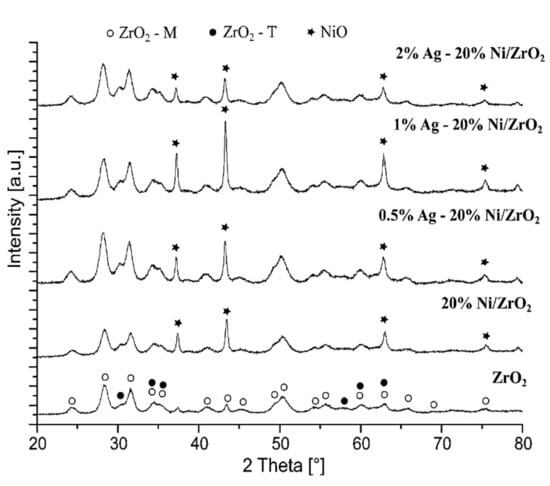 The X-ray diffraction studies (XRD) were used to determine the phase composition of the investigated catalytic materials being after calcination and the reaction processes. The calcination process was performed at 400 °C for 4 h, whereas the oxy-steam reforming of LNG reaction process was carried out using a fixed bed reactor in the temperature range 400–900 °C. Figure 8 presents the diffraction curves recorded for support, mono- and bimetallic catalysts after the calcination process. The XRD pattern recorded for ZrO2 support showed the diffraction peaks assigned to ZrO2-Monoclinic (positioned at 2θ angle: 24.6, 28.4, 31.5, 34.5, 35.2, 41.0, 43.4, 45.2, 49.4, 50.3, 54.2, 55.7, 60.2, 62.9, 66.0, 68.8 and 75.6), ZrO2-Tetragonal (positioned at 2θ angle: 30.5, 34.5, 35.2, 58.3, 60.2 and 62.9) phases. Meanwhile, XRD patterns recorded for the calcined mono- and bimetallic catalysts showed that the peaks assigned to tetragonal and monoclinic structures of ZrO2 phases also reflex attributed to NiO (positioned at 2θ angle: 37.3, 43.2, 62.8 and 75.5) phase. It is worth mentioning that, for the bimetallic catalysts, the diffraction peaks assigned to the silver oxide phase were not observed on the XRD patterns; this is explained by the detection limit of the XRD technique []. The phase composition studies for the spent bimetallic catalysts in the oxy-steam reforming of LNG process were also performed in this work. XRD curves recorded for the spent bimetallic Ag-Ni catalysts showed the diffraction peaks attributed to ZrO2 (positioned at 2θ angle: 24.6, 28.4, 31.5, 34.5, 35.5, 41.0, 41.6, 45.6, 49.4, 50.1, 51.9, 54.2, 55.7, 57.3, 58.3, 60.2, 61.7, 62.5, 62.9, 65.8, 69.3 and 71.7), NiO (positioned at 2θ angle: 37.3, 43.4, 62.8, 75.5 and 79.1), Ni (positioned at 2θ angle: 44.5, 51.9 and 76.5) and Ag (positioned at 2θ angle: 38.1, 44.5, 64.4 and 77.5) phases (see Figure 9). These results clearly confirmed the partial reduction of bimetallic nickel catalysts after OSR of LNG process. The existence of other phases on the diffraction curves of the bimetallic catalysts were not detected by the XRD technique.